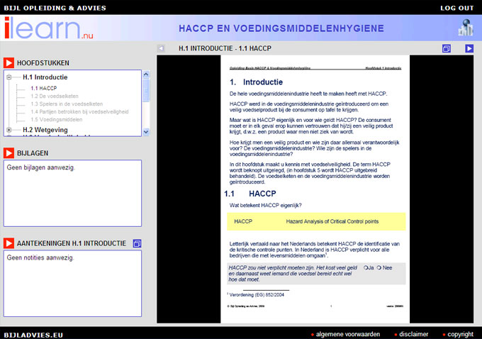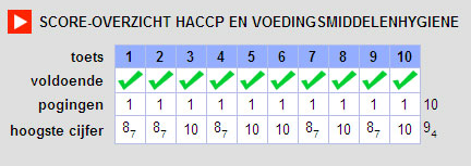 Aan het eind van de opleiding (na hoofdstuk 10) krijgt men een scoreoverzicht. Met groene vinkjes of rode kruisjes wordt aangegeven of de toets van het betreffende hoofdstuk goed resp. niet goed is gemaakt.